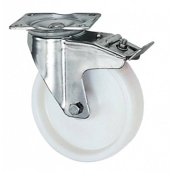 Roulette pivotante à frein avec une roue diamètre 160x45mm en polypropylène blanc naturel (65 shore D +/- 4), roulement à rouleaux.